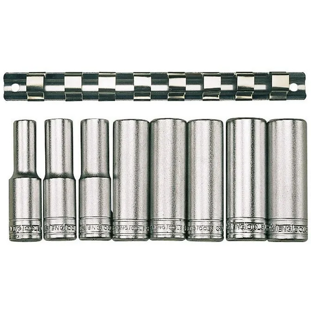 Set of 8 deep 1/2" drive 12 point metric sockets supplied on a clip rail. Made from chrome vanadium steel with a satin finish.