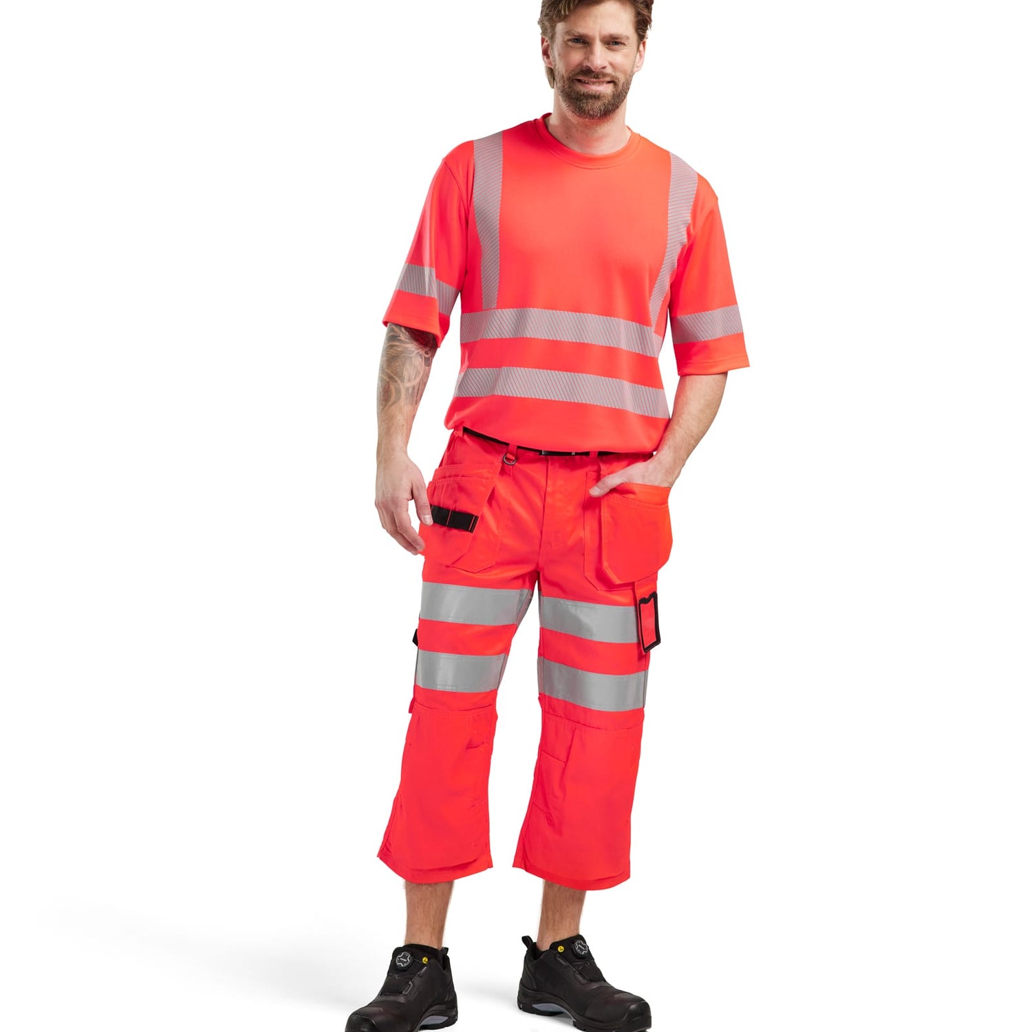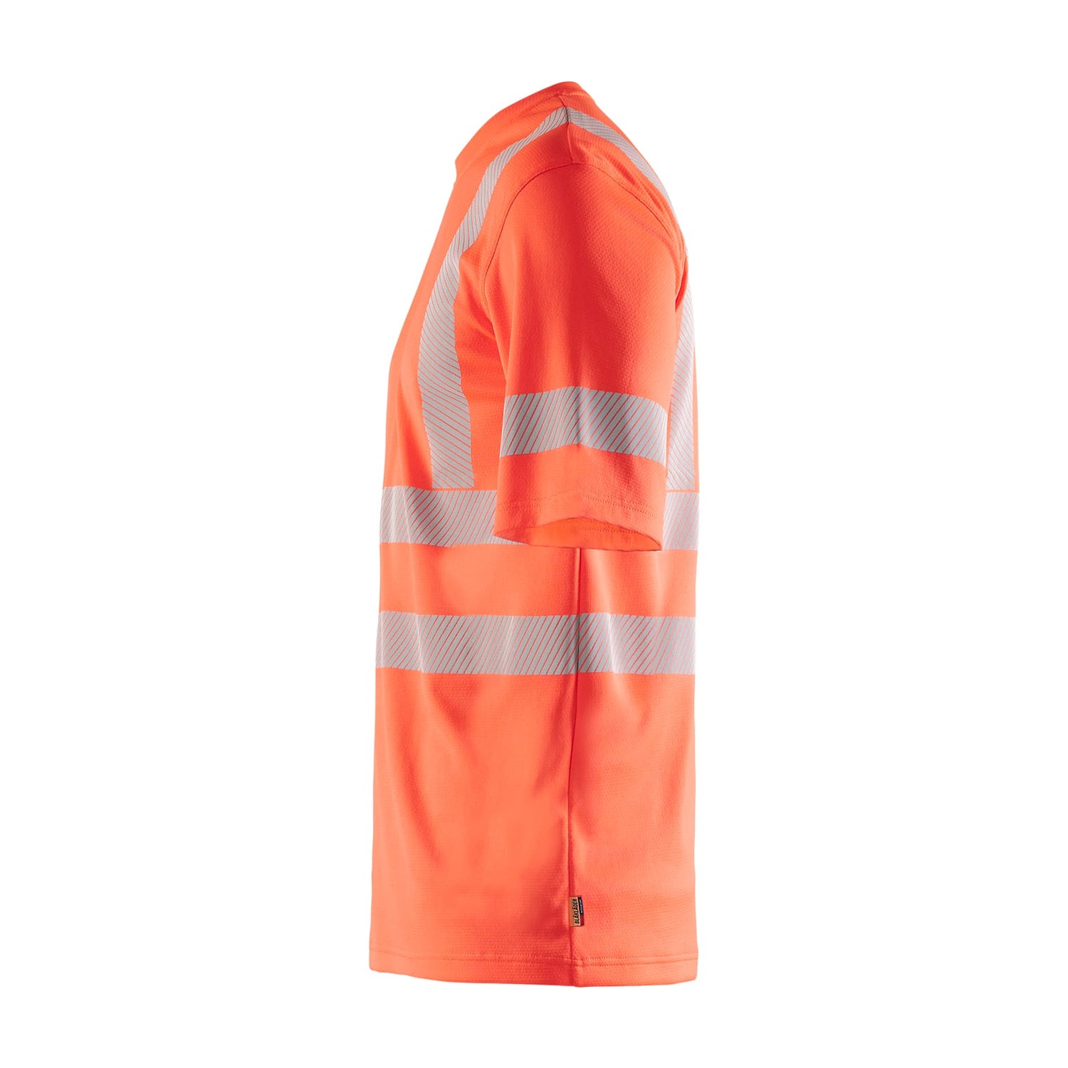 A Hi-vis t-shirt with segmented reflective tape for extra visibility. The material of the t-shirt has a great absorption capacity, which means that the sweat is transported out from the inside of the shirt and makes it settle on the outside.